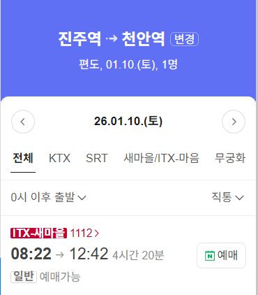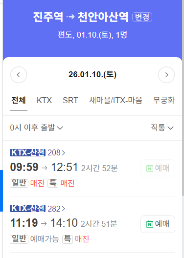 진주에서 평택!! 대중교통 알아봐요 진주에서 평택을 갈건데2026년 1월 10일 토요일 3시 스케줄이거든요.갈수있는 루트기차 버스 진주에서 평택을 갈건데2026년 1월 10일 토요일 3시 스케줄이거든요.갈수있는 루트기차 버스 등등 천안 평택 오산 동탄 부근으로최소최대 13-14시 쯤 도착 할 수 있는 대중교통 수단 없을까여?? ktx 매진